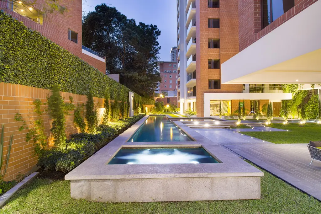 Piscina de nado y jacuzzi con diseño geométrico en Ciudad Guatemala