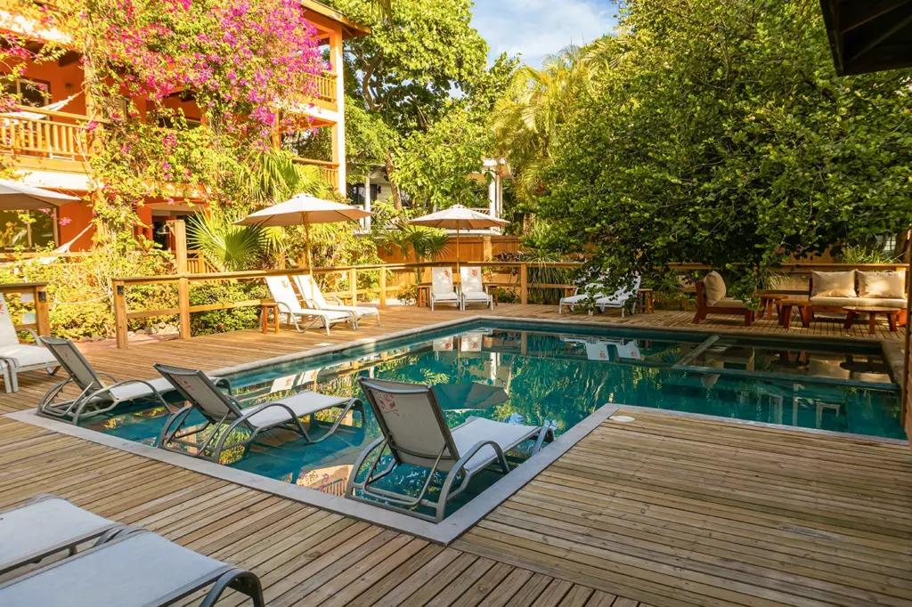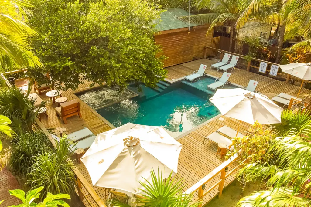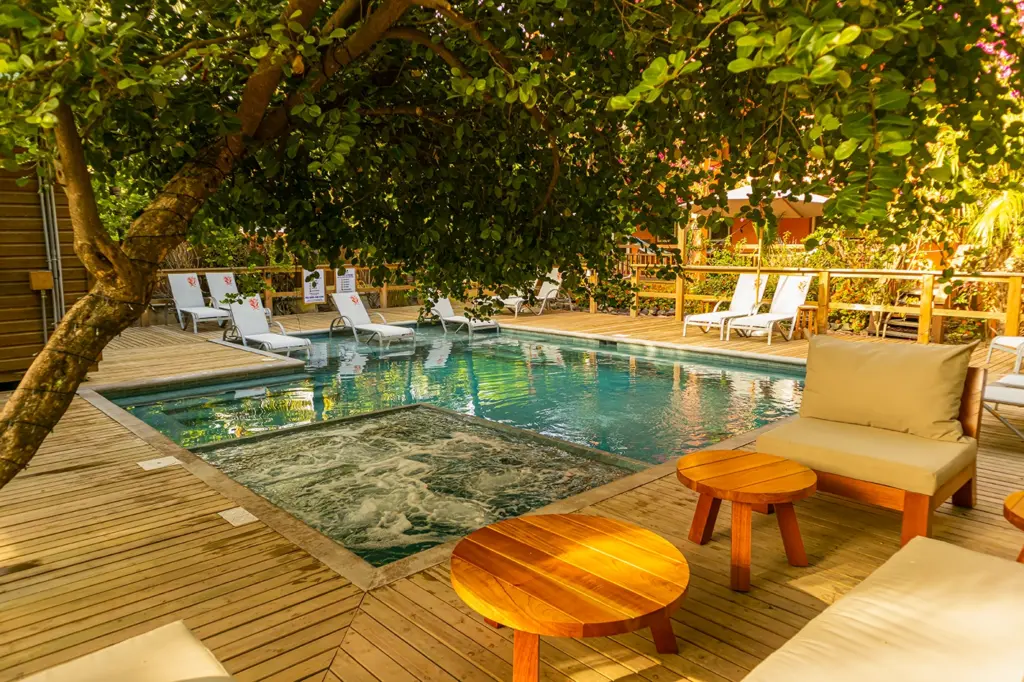 Este pequeño espacio acuático, el cual forma parte de un hotel, se desarrolló teniendo como punto de referencia un árbol ubicado en el lugar el cual, además, proporciona sombra.